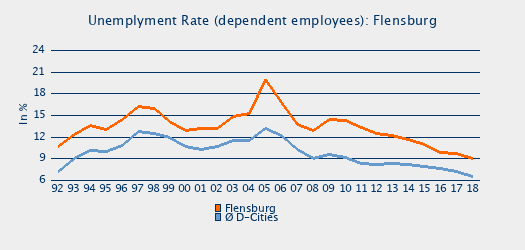 Unemployment Rate (dependent employed persons): Flensburg | | | Recent Unemployment Rate: September 2019: 9.1 % | | 2013 | 2014 | 2015 | 2016 | 2017 | 2018 | Δ 13-18 | Flensburg | 12.3 % | 11.7 % | 11.0 % | 9.9 % | 9.8 % | 9.1 % | -3.2 | Schleswig-Holstein Nord (RO-Region) | 8.8 % | 8.5 % | 7.8 % | 7.5 % | 7.3 % | 6.5 % | -2.3 | Schleswig-Holstein | 7.8 % | 7.6 % | 7.3 % | 7.0 % | 6.7 % | 6.1 % | -1.7 | Germany | 7.7 % | 7.5 % | 7.1 % | 6.8 % | 6.3 % | 5.8 % | -1.9 | Total Number of Unemployed | Flensburg | 5,205 | 5,087 | 4,870 | 4,495 | 4,512 | 4,304 | -17.3% |