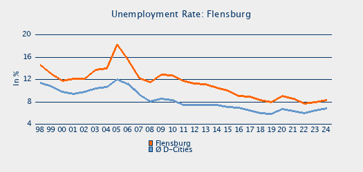 Unemployment Rate (all employed persons): Flensburg | | | Recent Unemployment Rate: September 2025: 8.6 % | | 2019 | 2020 | 2021 | 2022 | 2023 | 2024 | Δ 19-24 | Flensburg | 8.0 % | 9.1 % | 8.5 % | 7.7 % | 7.9 % | 8.3 % | 0.3 | Schleswig-Holstein Nord (RO-Region) | 5.2 % | 6.1 % | 5.8 % | 5.2 % | 5.6 % | 5.9 % | 0.6 | Schleswig-Holstein | 5.1 % | 5.8 % | 5.6 % | 5.2 % | 5.5 % | 5.7 % | 0.6 | Germany | 5.0 % | 5.9 % | 5.7 % | 5.3 % | 5.7 % | 6.0 % | 1.0 | Total Number of Unemployed | Flensburg | 4,174 | 4,722 | 4,369 | 3,970 | 4,131 | 4,417 | 5.8% |
