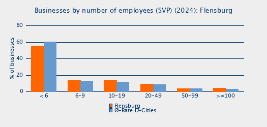 Number of Businesses and Percentages by Size of Business: Flensburg | | | | 2019 | 2020 | 2021 | 2022 | 2023 | 2024 | Δ 19-24 | Flensburg | 2,362 | 2,322 | 2,306 | 2,348 | 2,352 | 2,324 | -1.6 % | Percentage of businesses by business size: Flensburg | less than 6 employees | 57.1 % | 56.9 % | 56.7 % | 56.6 % | 56.3 % | 55.2 % | | 6 to 9 employees | 13.7 % | 14.1 % | 14.0 % | 13.9 % | 13.3 % | 13.9 % | | 10 to 19 employees | 13.0 % | 12.5 % | 12.4 % | 13.2 % | 13.9 % | 13.9 % | | 20 to 49 employees | 9.1 % | 9.3 % | 9.9 % | 8.9 % | 8.7 % | 9.1 % | | 50 to 99 employees | 3.6 % | 3.7 % | 3.6 % | 3.7 % | 3.8 % | 3.9 % | | 100 and more employees | 3.5 % | 3.4 % | 3.6 % | 3.7 % | 4.0 % | 4.0 % | | Percentage of employees by business size: Flensburg | less than 6 employees | 6.7 % | 6.6 % | 6.8 % | 6.7 % | 6.3 % | 6.1 % | | 6 to 9 employees | 5.3 % | 5.5 % | 5.5 % | 5.3 % | 5.0 % | 5.1 % | | 10 to 19 employees | 9.3 % | 8.8 % | 8.8 % | 9.4 % | 9.7 % | 9.4 % | | 20 to 49 employees | 15.1 % | 15.5 % | 16.4 % | 14.6 % | 13.7 % | 13.8 % | | 50 to 99 employees | 12.8 % | 13.4 % | 13.1 % | 13.3 % | 12.7 % | 13.1 % | | 100 and more employees | 50.8 % | 50.1 % | 49.4 % | 50.6 % | 52.6 % | 52.6 % | | | number of businesses | Schleswig-Holstein Nord (RO-Region) | 14,760 | 14,707 | 14,879 | 14,982 | 14,767 | 14,555 | -1.4 % | Schleswig-Holstein | 79,695 | 79,277 | 80,126 | 80,835 | 79,772 | 78,741 | -1.2 % | Germany | 2,183,580 | 2,167,795 | 2,180,620 | 2,193,492 | 2,162,420 | 2,138,116 | -2.1 % |