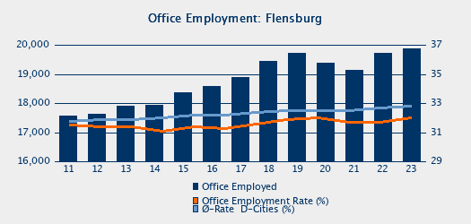 Office Employment: Flensburg | | | | 2018 | 2019 | 2020 | 2021 | 2022 | 2023 | Δ 18-23 | Flensburg (total) | 19,461 | 19,708 | 19,377 | 19,134 | 19,733 | 19,878 | 2.1 % | thereof SVP-office employed | 15,804 | 15,998 | 15,765 | 15,574 | 16,225 | 16,292 | 3.1 % | thereof by Occupation: Flensburg | managerial occupations | 7 % | 7 % | 7 % | 8 % | 8 % | 7 % | | administrative occupations | 36 % | 35 % | 35 % | 35 % | 36 % | 36 % | | finance occupations | 3 % | 3 % | 3 % | 3 % | 3 % | 3 % | | technical occupations | 20 % | 20 % | 20 % | 19 % | 19 % | 19 % | | consulting services | 15 % | 15 % | 15 % | 16 % | 16 % | 16 % | | merchants | 9 % | 10 % | 10 % | 10 % | 9 % | 9 % | | | Schleswig-Holstein Nord (RO-Region) | 69,570 | 70,234 | 69,560 | 70,432 | 71,764 | 72,236 | 3.8 % | Schleswig-Holstein | 430,769 | 434,946 | 432,073 | 436,599 | 441,861 | 446,119 | 3.6 % | Germany | 14,805,825 | 14,979,193 | 14,860,840 | 14,988,680 | 15,203,990 | 15,326,378 | 3.5 % |