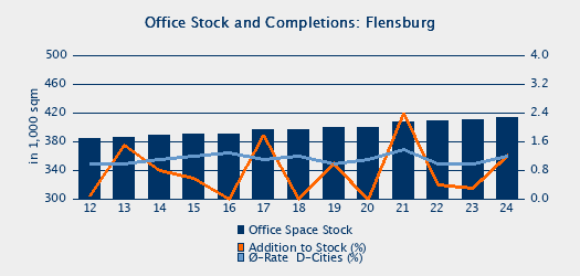 Office Stock and Completions: Flensburg | | 2017 | 2018 | 2019 | 2020 | 2021 | 2022 | 2023 | 2024 | Δ 20-24 | office stock, net floorspace (RA-C, gif) in 1,000 sqm | 397 | 397 | 401 | 401 | 408 | 410 | 410 | 415 | 3.4 % | avg floorspace per office employee (sqm) | 20.0 | 19.6 | 19.7 | 20.2 | 20.9 | 20.6 | 20.3 | 20.3 | 0.5 % | | | | | | | | | | Ø 20-24 | completion (sqm) | 7,200 | 0 | 3,900 | 0 | 9,600 | 1,800 | 1,100 | 5,000 | 3,500 | addition to stock in % of stock | 1.8 % | 0.0 % | 1.0 % | 0.0 % | 2.4 % | 0.4 % | 0.3 % | 1.2 % | | | Completions and Planning Permissions according to Official Statistics | | 2017 | 2018 | 2019 | 2020 | 2021 | 2022 | 2023 | 2024 | Ø 20-23 | completion: floorspace in office buildings (sqm) | | 5,273 | 4,288 | | 8,643 | 4,385 | 3,500 | | 5,509 | planning permission: floorspace in office buildings (sqm) | | 3,628 | 5,023 | 7,308 | 4,204 | 11,136 | | | 7,549 | planning permission surplus | | -1,645 | 735 | | -4,439 | 6,751 | | | 1,156 |
