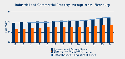 Rents and Prices for Commercial Property: Flensburg | Euro / sqm | 2014 | 2015 | 2016 | 2017 | 2018 | 2019 | 2020 | 2021 | 2022 | 2023 | 2024 | Δ 19-24 | Warehouses and Logistics | Prime Rent | 4.0 | 4.1 | 4.1 | 4.1 | 4.0 | 3.9 | 4.0 | 4.0 | 4.2 | 4.4 | 4.5 | 15.4% | Average Rent | 2.8 | 2.9 | 3.0 | 3.0 | 3.0 | 3.0 | 3.0 | 3.1 | 3.2 | 3.4 | 3.4 | 13.3% | Showrooms and Services | Prime Rent | 4.7 | 4.7 | 4.7 | 4.8 | 5.0 | 5.0 | 5.1 | 5.1 | 5.2 | 5.4 | 5.5 | 10.0% | Average Rent | 4.0 | 4.1 | 4.1 | 4.2 | 4.3 | 4.3 | 4.3 | 4.4 | 4.5 | 4.7 | 4.7 | 9.3% | Commercial Land | Average Price | 32 | 32 | 32 | 32 | 35 | 35 | 35 | 35 | 35 | 34 | 34 | -2.9% | Net Initial Yield, Logistics and Warehouses | Prime Net Yield | 8.4% | 8.0% | 7.5% | 7.0% | 6.8% | 6.7% | 6.7% | 5.6% | 5.9% | 6.4% | 6.7% | 0.0 | Average Net Yield | 9.5% | 9.4% | 9.3% | 9.0% | 8.5% | 8.8% | 8.6% | 7.0% | 7.3% | 7.7% | 8.0% | -0.8 |