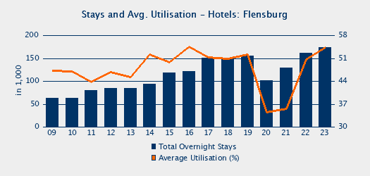 Accommodation Statistics for Hotels, Hotel garni, Guesthouses, Inns, B&B: Flensburg | Bedspaces | 1,367 | 1,372 | 1,380 | 1,343 | 1,587 | 1,465 | | Overnight Stays | 259,041 | 259,549 | 265,645 | 163,581 | 204,346 | 281,308 | | Arrivals | 164,646 | 163,538 | 167,800 | 95,137 | 107,074 | 165,860 | | Ø Length of Stay (Days) | 1.6 | 1.6 | 1.6 | 1.7 | 1.9 | 1.7 | |