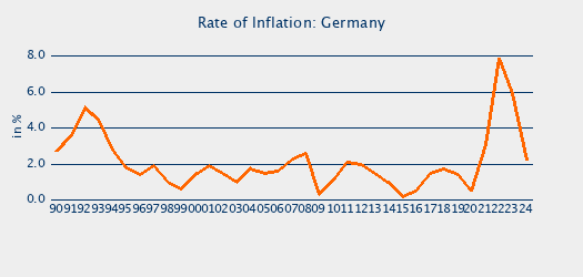 Rate of Inflation: Germany | | 2000 | 2001 | 2002 | 2003 | 2004 | 2005 | 2006 | 2007 | 2008 | 2009 | 2010 | 2011 | 2012 | 2013 | 2014 | 2015 | 2016 | 2017 | 2018 | 2019 | 2020 | 2021 | 2022 | 2023 | 2024 | rate of inflation | 1.4 % | 1.9 % | 1.5 % | 1.0 % | 1.7 % | 1.5 % | 1.6 % | 2.3 % | 2.6 % | 0.3 % | 1.1 % | 2.1 % | 2.0 % | 1.5 % | 0.9 % | 0.2 % | 0.5 % | 1.5 % | 1.7 % | 1.4 % | 0.5 % | 3.1 % | 7.9 % | 5.9 % | 2.2 % | harmonised | 1.4 % | 1.8 % | 1.4 % | 1.0 % | 1.8 % | 1.9 % | 1.8 % | 2.3 % | 2.8 % | 0.2 % | 1.2 % | 2.5 % | 2.1 % | 1.6 % | 0.8 % | 0.2 % | 0.4 % | 1.7 % | 1.9 % | 1.4 % | 0.4 % | 3.2 % | 8.7 % | 6.0 % | 2.5 % |
