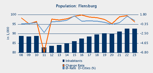 Population: Flensburg | | | | 2018 | 2019 | 2020 | 2021 | 2022 | 2023 | Δ 18-23 | Flensburg | 89,504 | 90,164 | 89,934 | 91,113 | 96,217 | 96,431 | 7.7 % | Schleswig-Holstein Nord (RO-Region) | 455,036 | 457,271 | 459,728 | 462,472 | 469,358 | 471,240 | 3.6 % | Schleswig-Holstein | 2,896,712 | 2,903,773 | 2,910,875 | 2,922,005 | 2,939,283 | 2,953,202 | 2.0 % | Germany | 83,019,213 | 83,166,711 | 83,155,031 | 83,237,124 | 83,118,501 | 83,456,045 | 0.5 % | from 2022 data based on the Census 2022 |