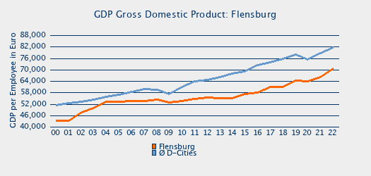 GDP per Employee in Euro: Flensburg - WZ08/2014 | € | 2017 | 2018 | 2019 | 2020 | 2021 | 2022 | Δ 17-22 | Flensburg | 61,223 | 61,171 | 64,469 | 63,870 | 66,171 | 70,627 | 15.4 % | Schleswig-Holstein Nord (RO-Region) | 62,309 | 61,776 | 65,289 | 65,936 | 68,297 | 73,870 | 18.6 % | Schleswig-Holstein | 66,403 | 67,072 | 69,487 | 69,827 | 73,188 | 77,922 | 17.3 % | Germany | 73,832 | 75,011 | 76,732 | 75,782 | 80,416 | 85,025 | 15.2 % | GDP in Million Euro: Flensburg - WZ08/2014 | Flensburg | 3,666 | 3,732 | 3,971 | 3,907 | 3,992 | 4,353 | 18.8 % |