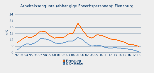 Arbeitslosenquote (abhängige Erwerbspersonen): Flensburg | | | Arbeitslosenquote Stand September 2019: 9,1 % | | 2013 | 2014 | 2015 | 2016 | 2017 | 2018 | Δ 13-18 | Flensburg | 12,3 % | 11,7 % | 11,0 % | 9,9 % | 9,8 % | 9,1 % | -3,2 | Schleswig-Holstein Nord (RO-Region) | 8,8 % | 8,5 % | 7,8 % | 7,5 % | 7,3 % | 6,5 % | -2,3 | Schleswig-Holstein | 7,8 % | 7,6 % | 7,3 % | 7,0 % | 6,7 % | 6,1 % | -1,7 | Deutschland | 7,7 % | 7,5 % | 7,1 % | 6,8 % | 6,3 % | 5,8 % | -1,9 | Anzahl der Arbeitslosen gesamt | Flensburg | 5.205 | 5.087 | 4.870 | 4.495 | 4.512 | 4.304 | -17,3% |