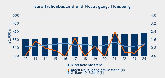 | Büroflächenbestand und Neuzugang: Flensburg | | | 2017 | 2018 | 2019 | 2020 | 2021 | 2022 | 2023 | 2024 | Δ 20-24 | | Büroflächenbestand MFG in 1.000 qm | 397 | 397 | 401 | 401 | 408 | 410 | 410 | 415 | 3,4 % | | Durchschnittliche Bürofläche je Beschäftigten | 20,0 | 19,6 | 19,7 | 20,2 | 20,9 | 20,6 | 20,3 | 20,3 | | | | | | | | | | | | Ø 20-24 | | Neuzugang (qm) | 7.200 | 0 | 3.900 | 0 | 9.600 | 1.800 | 1.100 | 5.000 | 3.500 | | Anteil des Neuzugangs am Bestand | 1,8 % | 0,0 % | 1,0 % | 0,0 % | 2,4 % | 0,4 % | 0,3 % | 1,2 % | | | | | Fertigstellungen und Genehmigungen laut amtlicher Statistik | | | 2017 | 2018 | 2019 | 2020 | 2021 | 2022 | 2023 | 2024 | Ø 20-23 | | Fertigstellung: Nutzfläche in Bürogebäuden (qm) | | 5.273 | 4.288 | | 8.643 | 4.385 | 3.500 | | 5.509 | | Genehmigung: Nutzfläche in Bürogebäuden (qm) | | 3.628 | 5.023 | 7.308 | 4.204 | 11.136 | | | 7.549 | | Genehmigungsüberhang | | -1.645 | 735 | | -4.439 | 6.751 | | | 1.156 |