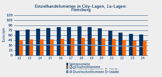 Mieten und Renditen Einzelhandel: Flensburg | € / qm | 2014 | 2015 | 2016 | 2017 | 2018 | 2019 | 2020 | 2021 | 2022 | 2023 | 2024 | Δ 19-24 | City (1a-Lage) | Spitzenmiete | 80,0 | 82,0 | 85,0 | 85,0 | 87,0 | 85,0 | 81,0 | 73,5 | 68,0 | 65,0 | 63,0 | -25,9% | Durchschnittsmiete | 48,0 | 48,0 | 50,0 | 52,0 | 53,0 | 52,0 | 50,5 | 48,5 | 46,5 | 44,5 | 43,0 | -17,3% | City Nebenlagen (1b-Lage) | Spitzenmiete | 35,0 | 35,0 | 35,0 | 36,0 | 37,0 | 38,0 | 36,5 | 34,0 | 32,0 | 30,0 | 29,0 | -23,7% | Stadtteillage | Spitzenmiete | 20,0 | 20,0 | 20,0 | 20,0 | 20,0 | 19,0 | 19,0 | 18,0 | 17,0 | 17,0 | 17,0 | -10,5% | Durchschnittsmiete | 11,5 | 11,5 | 11,5 | 11,5 | 11,5 | 11,5 | 11,5 | 11,0 | 10,5 | 10,5 | 10,5 | -8,7% | Nettoanfangs-Rendite | City, 1a-Lage | 6,6 % | 6,4 % | 6,0 % | 5,4 % | 4,9 % | 4,6 % | 4,6 % | 4,7 % | 5,0 % | 5,4 % | 5,6 % | 1,0 | Fachmarkt, dezentrale Lagen | 7,7 % | 7,4 % | 7,0 % | 6,6 % | 6,1 % | 5,7 % | 5,4 % | 5,2 % | 5,5 % | 5,7 % | 5,9 % | 0,2 |
