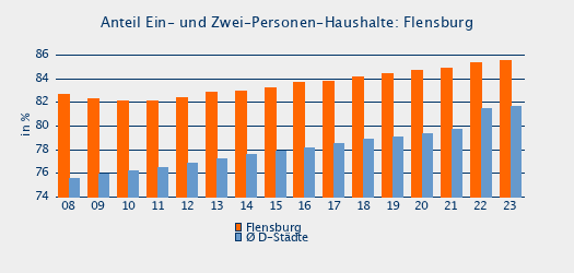 Anzahl der Haushalte (Basis BBSR*): Flensburg | | | | 2018 | 2019 | 2020 | 2021 | 2022 | 2023 | Δ 18-23 | Flensburg | 49.178 | 49.541 | 49.687 | 50.339 | 53.232 | 53.424 | 8,6 % | Schleswig-Holstein Nord (RO-Region) | 232.862 | 234.527 | 236.452 | 238.846 | 242.885 | 244.168 | 4,9 % | Schleswig-Holstein | 1.464.352 | 1.472.120 | 1.480.368 | 1.489.549 | 1.501.113 | 1.510.169 | 3,1 % | Deutschland | 42.293.844 | 42.500.672 | 42.615.688 | 42.802.672 | 42.799.080 | 43.028.924 | 1,7 % | Haushaltsstruktur 2023: Flensburg | Anteil der Haushalte mit ... Person(en) | Einer | Zwei | Drei | 4 und mehr | Ø Einwohner je Haushalt | Flensburg | 42,5 % | 43,1 % | 7,1 % | 7,3 % | 1,8 | Schleswig-Holstein Nord (RO-Region) | 39,6 % | 40,7 % | 9,3 % | 10,4 % | 1,9 | Schleswig-Holstein | 40,5 % | 38,4 % | 10,2 % | 10,9 % | 2,0 | Deutschland | 41,9 % | 36,6 % | 10,7 % | 10,7 % | 1,9 |