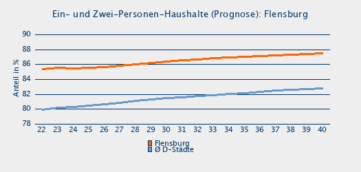Anzahl der Haushalte: Flensburg | | | | 2022 | 2025 | 2030 | 2035 | 2040 | Δ 22-40 | Flensburg | 53.232 | 53.978 | 55.373 | 56.297 | 56.926 | 6,9 % | Schleswig-Holstein Nord (RO-Region) | 242.885 | 245.116 | 246.916 | 245.811 | 243.693 | 0,3 % | Schleswig-Holstein | 1.501.113 | 1.520.245 | 1.533.483 | 1.529.817 | 1.522.370 | 1,4 % | Deutschland | 42.799.080 | 43.439.996 | 44.059.260 | 44.239.416 | 44.278.932 | 3,5 % | Haushaltsstruktur 2040: Flensburg | Anteil der Haushalte mit ... Person(en) | Einer | Zwei | Drei | 4 und mehr | Ø Einwohner je Haushalt | Flensburg | 42,7 % | 44,8 % | 6,5 % | 6,0 % | 1,8 | Schleswig-Holstein Nord (RO-Region) | 40,0 % | 42,4 % | 8,7 % | 8,9 % | 1,9 | Schleswig-Holstein | 41,4 % | 39,9 % | 9,2 % | 9,4 % | 1,9 | Deutschland | 43,1 % | 38,1 % | 9,6 % | 9,2 % | 1,9 |