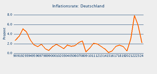 Inflationsrate: Deutschland | | 2010 | 2011 | 2012 | 2013 | 2014 | 2015 | 2016 | 2017 | 2018 | 2019 | 2020 | 2021 | 2022 | 2023 | 2024 | Inflationsrate | 1,1 % | 2,1 % | 2,0 % | 1,5 % | 0,9 % | 0,2 % | 0,5 % | 1,5 % | 1,7 % | 1,4 % | 0,5 % | 3,1 % | 7,9 % | 5,9 % | 2,2 % | harmonisierte Inflationsrate | 1,2 % | 2,5 % | 2,1 % | 1,6 % | 0,8 % | 0,2 % | 0,4 % | 1,7 % | 1,9 % | 1,4 % | 0,4 % | 3,2 % | 8,7 % | 6,0 % | 2,5 % |
