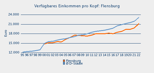 Verfügbares Einkommen (Revision 2011) privater Haushalte: Flensburg | | | | 2017 | 2018 | 2019 | 2020 | 2021 | 2022 | Δ 17-22 | Flensburg | in Mio € | 1.627 | 1.669 | 1.741 | 1.749 | 1.798 | 1.940 | 19,3% | pro Kopf (Euro) | 18.493 | 18.753 | 19.379 | 19.427 | 19.868 | 21.130 | 14,3% | je Haushalt (Euro) | 33.634 | 33.942 | 35.141 | 35.208 | 36.019 | 38.461 | 14,4% | Verhältnis Verfügbares Einkommen/ Primär-Einkommen | 84,9 % | 84,6 % | 84,4 % | 87,3 % | 86,5 % | 87,5 % | | Schleswig-Holstein Nord (RO-Region) | in Mio € | 10.269 | 10.563 | 11.091 | 11.127 | 11.402 | 12.342 | 20,2% | pro Kopf (Euro) | 22.701 | 23.249 | 24.312 | 24.273 | 24.723 | 26.495 | 16,7% | je Haushalt (Euro) | 44.481 | 45.363 | 47.292 | 47.059 | 48.056 | 51.993 | 16,9% | Verhältnis Verfügbares Einkommen/ Primär-Einkommen | 89,0 % | 89,0 % | 88,7 % | 90,6 % | 89,9 % | 89,0 % | | Schleswig-Holstein | in Mio € | 65.265 | 67.873 | 69.676 | 70.783 | 72.738 | 77.776 | 19,2% | pro Kopf (Euro) | 22.615 | 23.459 | 24.024 | 24.347 | 24.941 | 26.476 | 17,1% | je Haushalt (Euro) | 44.787 | 46.350 | 47.331 | 47.815 | 48.938 | 52.127 | 16,4% | Verhältnis Verfügbares Einkommen/ Primär-Einkommen | 84,1 % | 84,3 % | 84,0 % | 86,0 % | 85,3 % | 84,5 % | | Deutschland | in Mio € | 1.844.458 | 1.920.281 | 1.961.183 | 1.986.970 | 2.035.553 | 2.164.467 | 17,3% | pro Kopf (Euro) | 22.315 | 23.162 | 23.602 | 23.893 | 24.467 | 25.830 | 15,8% | je Haushalt (Euro) | 43.849 | 45.375 | 46.115 | 46.595 | 47.495 | 50.278 | 14,7% | Verhältnis Verfügbares Einkommen/ Primär-Einkommen | 81,3 % | 81,3 % | 81,0 % | 83,2 % | 82,4 % | 82,1 % | |