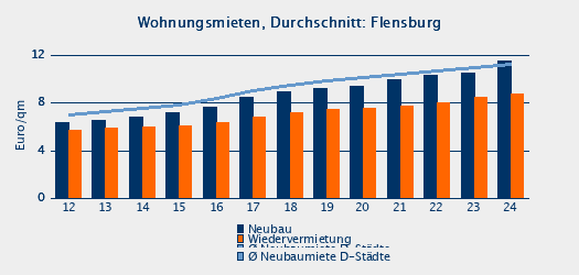 Wohnungsmieten und Vervielfacher: Flensburg | | 2014 | 2015 | 2016 | 2017 | 2018 | 2019 | 2020 | 2021 | 2022 | 2023 | 2024 | Δ 19-24 | Wohnungsmieten Neubau: Euro / qm | von ... | 6,20 | 6,50 | 6,60 | 6,80 | 7,10 | 7,40 | 7,60 | 8,00 | 8,20 | 8,20 | 8,50 | 14,9% | ... bis | 8,50 | 8,70 | 9,50 | 10,50 | 11,00 | 11,40 | 11,80 | 12,70 | 13,00 | 13,50 | 13,80 | 21,1% | Durchschnitt | 6,80 | 7,20 | 7,70 | 8,50 | 9,00 | 9,20 | 9,40 | 10,00 | 10,30 | 10,50 | 11,50 | 25,0% | Wohnungsmieten Wiedervermietung: Euro / qm | von ... | 4,50 | 4,60 | 5,00 | 5,70 | 6,20 | 6,50 | 6,50 | 6,70 | 6,90 | 7,00 | 7,00 | 7,7% | ... bis | 7,50 | 7,70 | 8,50 | 8,80 | 9,30 | 9,60 | 9,70 | 10,10 | 10,50 | 11,40 | 11,80 | 22,9% | Durchschnitt | 6,00 | 6,10 | 6,40 | 6,80 | 7,20 | 7,50 | 7,60 | 7,80 | 8,00 | 8,50 | 8,80 | 17,3% | Vervielfacher für Mehrfamilienhäuser (Bestand) | von ... | 9,3 | 10,0 | 11,0 | 12,5 | 14,5 | 14,5 | 14,5 | 15,5 | 16,0 | 13,5 | 12,0 | -2,5 | ... bis | 15,0 | 16,5 | 18,0 | 19,0 | 20,0 | 20,5 | 21,0 | 22,5 | 23,0 | 20,0 | 20,0 | -0,5 | Durchschnitt | 12,0 | 13,0 | 14,0 | 15,0 | 16,5 | 17,0 | 17,5 | 19,0 | 19,0 | 16,0 | 15,0 | -2,0 |